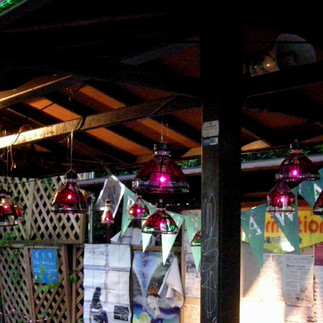 東屋にはペットボトルで作成したバラのステンドグラス風ランプシェードを下げました。