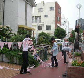 会員総参加で「カラーファイル」で三角フラッグとバラのステンドグラス風フラッグのガーランドを作り馬場川通り歩道一帯に飾りました。
